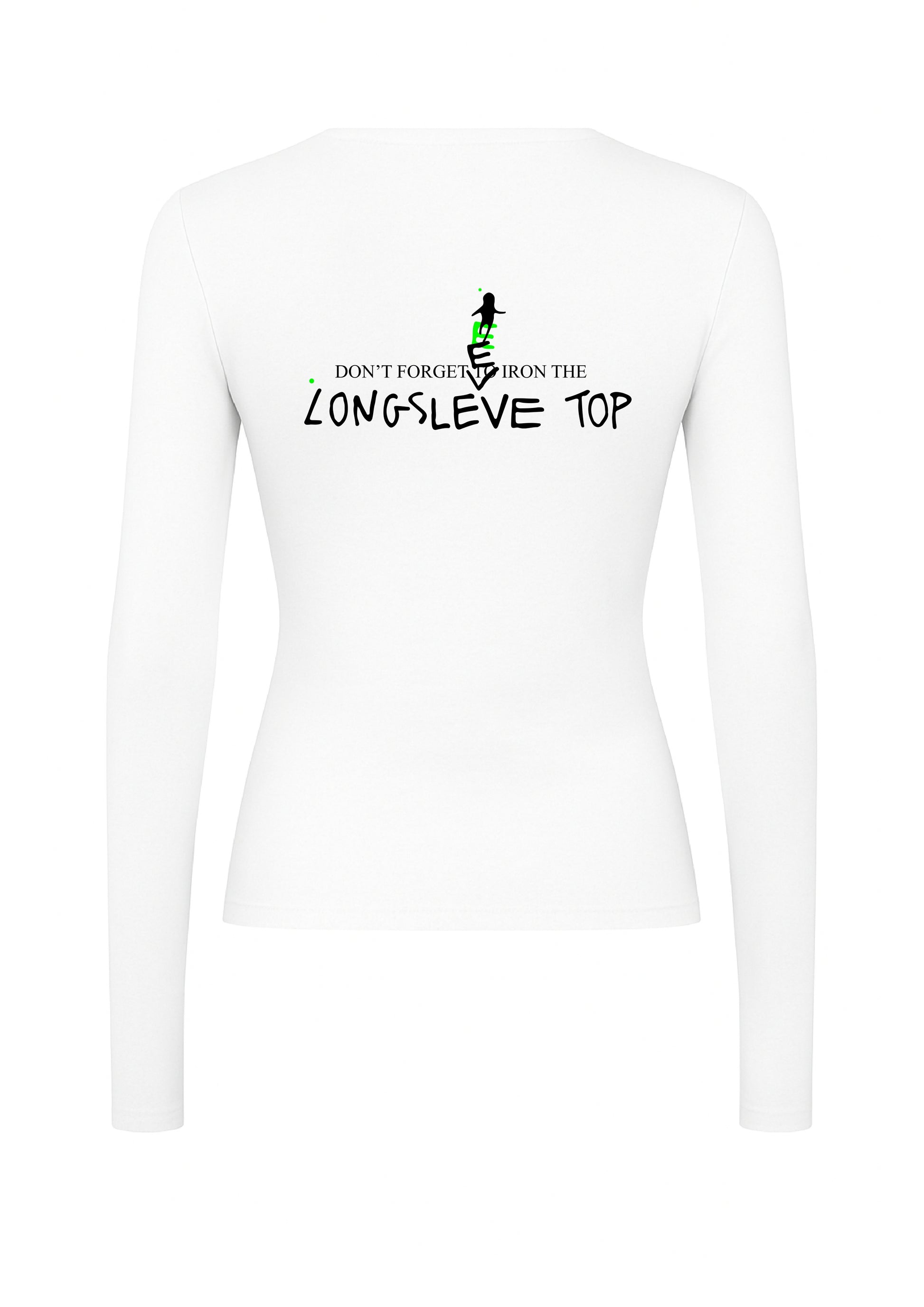 Imprimeu spate: fraza scrisă de mână „DON’T FORGET TO IRON THE LONGSLEVE TOP”